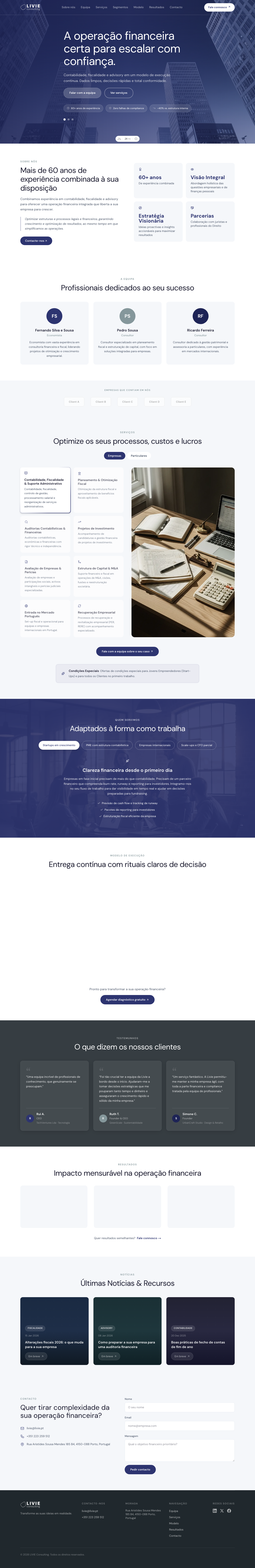 Website institucional para operações financeiras integradas - contabilidade, fiscalidade e consultoria com mais de 60 anos de experiência combinada.